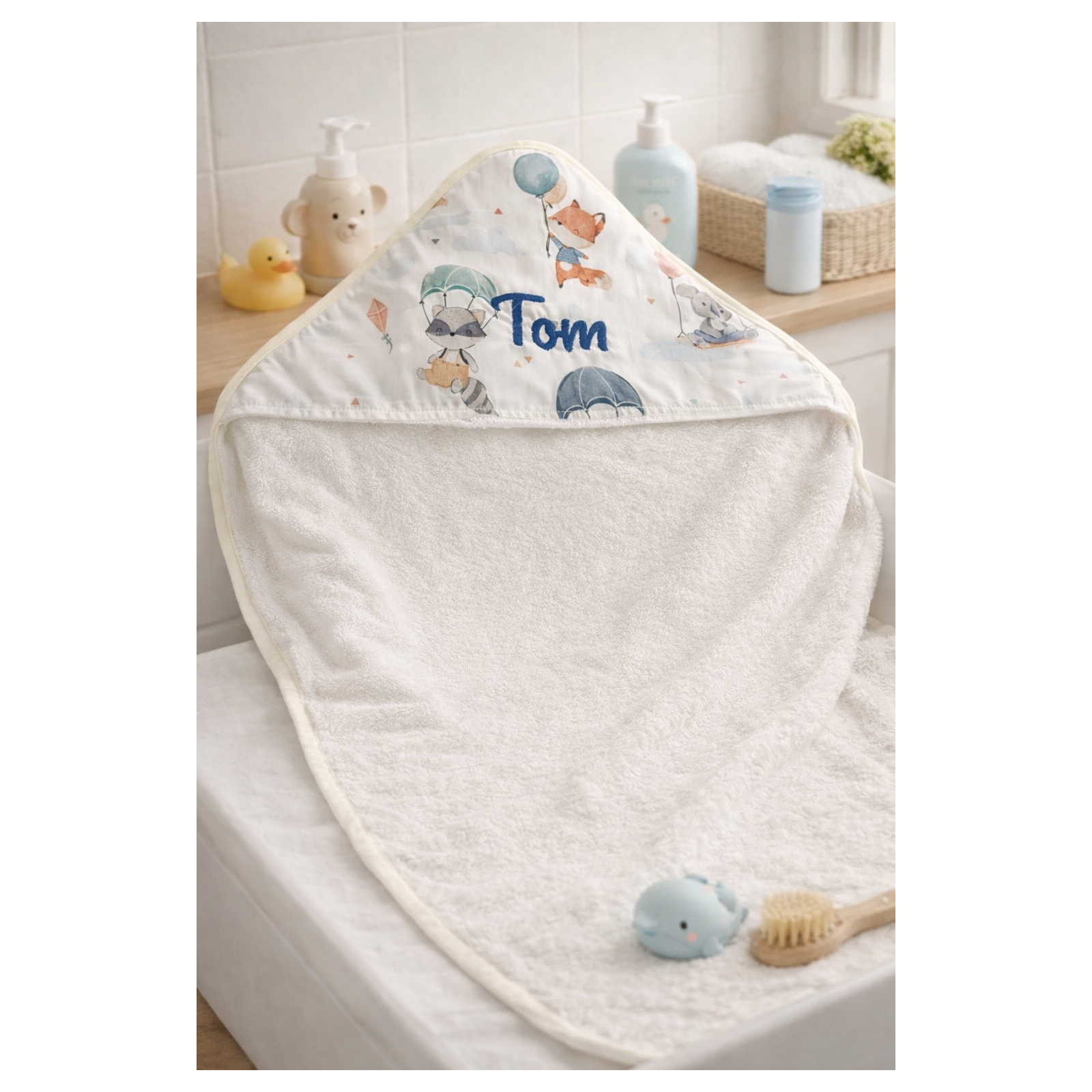 Une cape de bain toute douce pour bébé brodée avec son prénom.