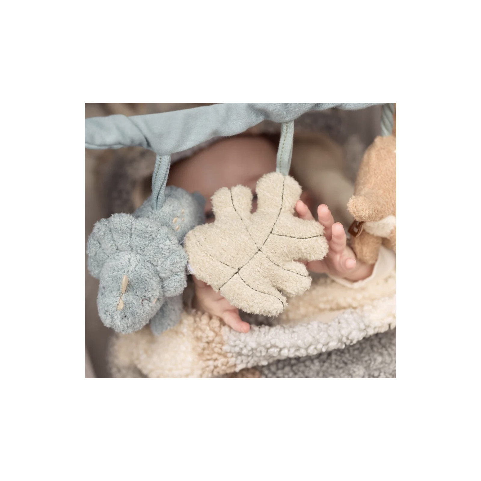 Chaque animal a un design et un tissu uniques, les deux dinosaures et la feuille dans les couleurs Sea Green, Olive Green, Oatmeal et Biscuit. Cette chaîne d'activités de poussette, votre tout-petit aura toujours quelque chose d'amusant à regarder et à découvrir lors des promenades.
